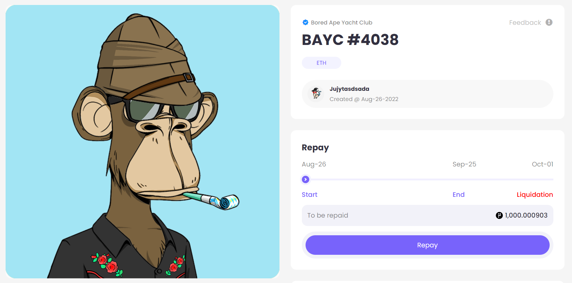 In the detail page, you will be able to see all information of this order. Click \[Approve] to authorize repayment. After approval, click \[Repay] to initiate transaction. You can redeem your NFT after repaying your loan along with the interest accrued during the period.